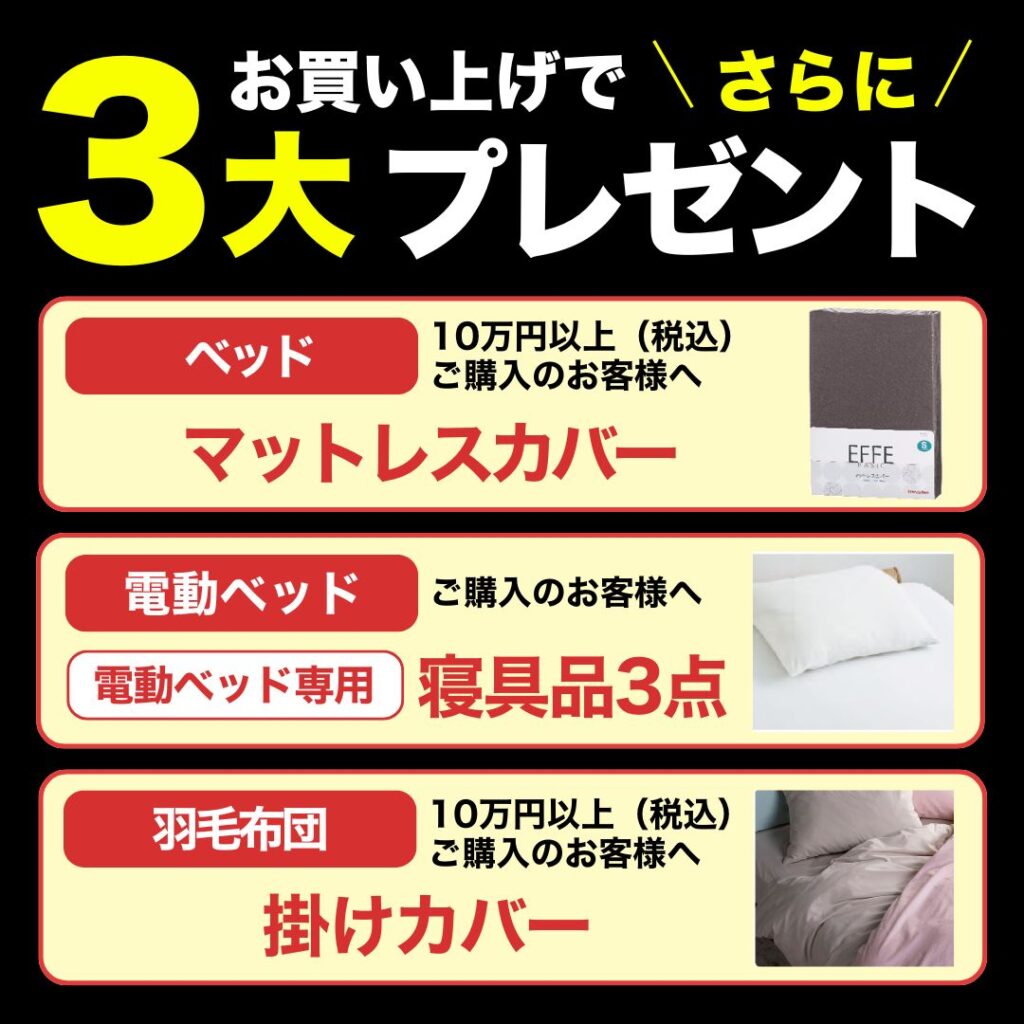 安心価格、アフターフォローも万全です。同時開催でいろいろなタイプの電動ベッドが体感できる〝電動リクライニングベッドセール〟マットレスを買替えの方にはお得な〝マットレス買替キャンペーン〟を実施します!