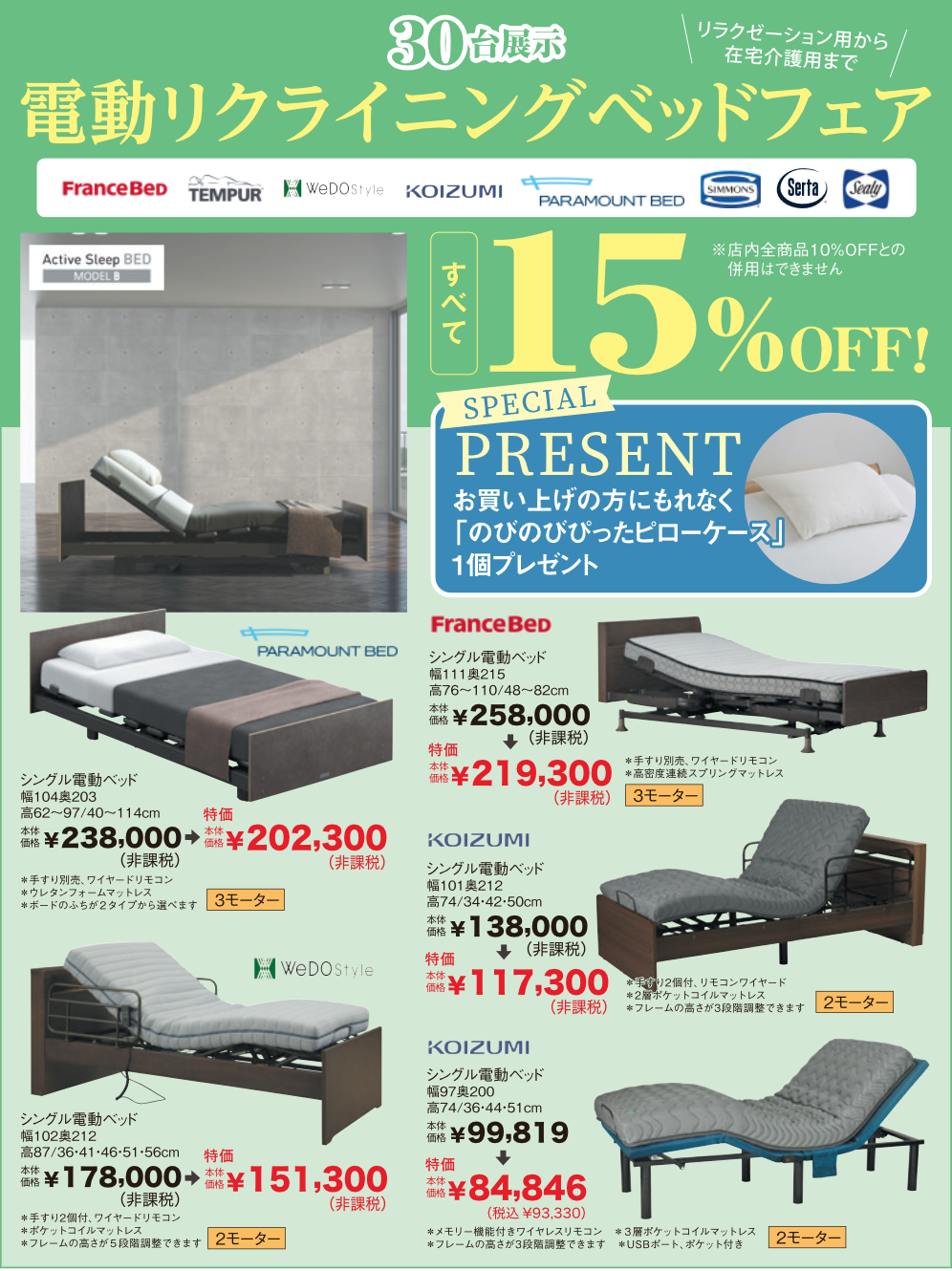 リラクゼーション用から在宅介護用まで30台の電動リクライニングベッドを展示しております。