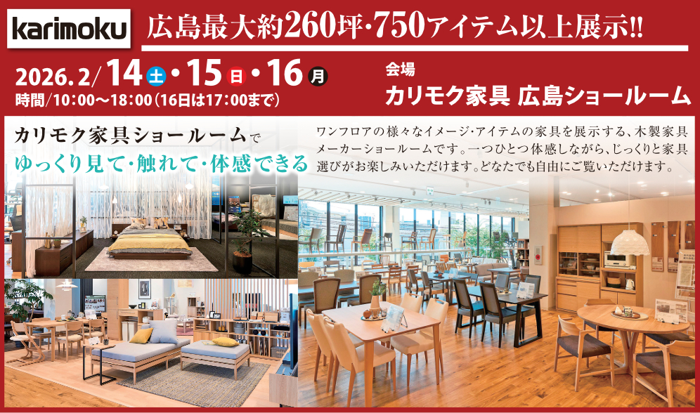 第二弾としてカリモク家具広島ショールームにて【グランドインテリアフェア】を開催致します。
