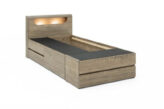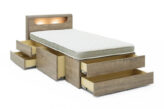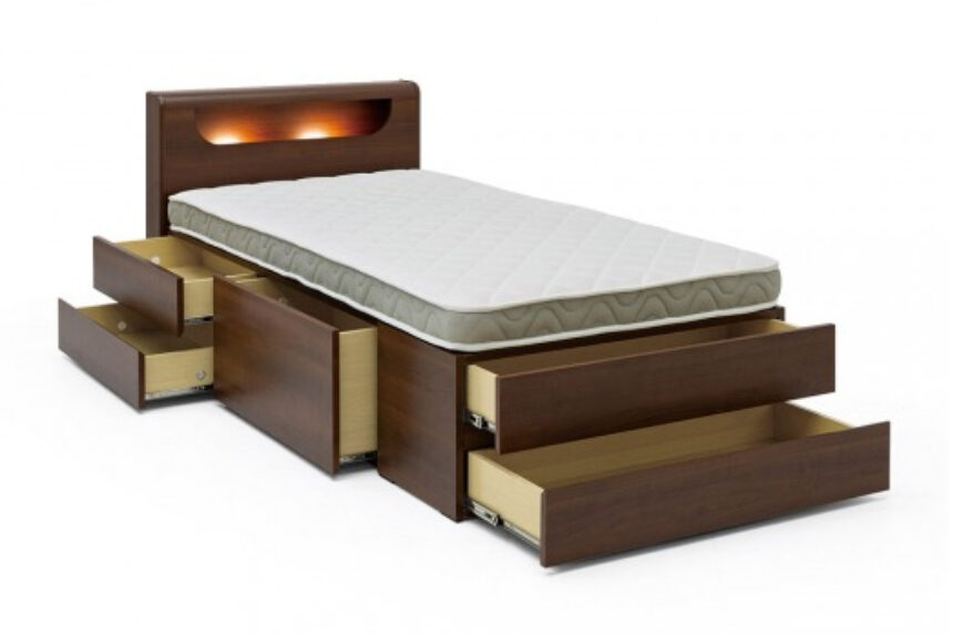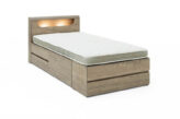 【睡眠スペース】と【大容量の収納】を1つにまとめられ、お部屋に収納棚を置くスペースで悩んでいる方にピッタリのチェストベッドです。ヘッドボードには小物を置ける棚、コンセントやLED照明も備えており、空間を効率よく活用できます。