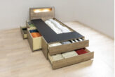 ベッドサイドや脚元にも大容量の収納が可能なすっきり暮らしのベッドフレーム